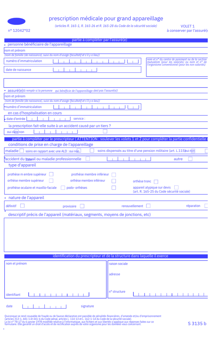 Celle-ci doit être faite sur le cerfa 12042*02 (prescription médicale pour grand appareillage).